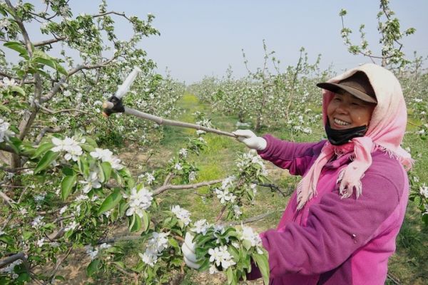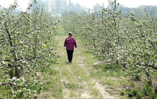 果农为苹果花进行人工授粉。