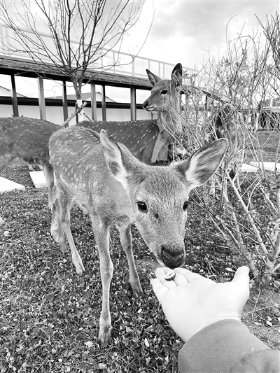 在辽宁梅花鹿(西丰)现代农业产业园,梅花鹿与游客亲密接触。